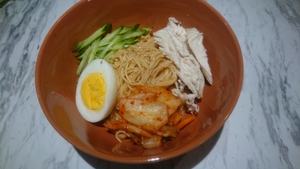 4.茹でた素麺に③の調味料を絡めたら器に盛り、キムチ、キュウリ、ゆで卵、鶏肉を盛り付け最後に白ごまを散らす。