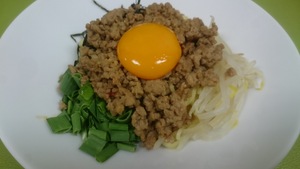 3.ゆでた中華麺を丼に盛り、湯がいたもやし、刻んだニラ、松葉海苔を放射状にのせ、中央に2の肉味噌をのせて真ん中を少しくぼませ、卵黄をのせる