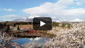 早朝、朝日が昇ると妙高山を背景に桜が一段と輝きます。農業用として造られたため池ができた時、その周囲に桜が植樹されました。その後、遊園地やゴルフ場のオープンにあわせて数を増やし、今では1500本ものソメイヨシノが咲き誇ります。番組では特別にゴルフ場の中からも撮影させていただき、芝の緑と桜のコラボもカメラに収めました。