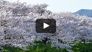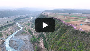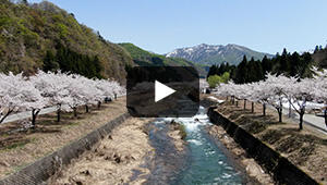 岩原スキー場の下を流れる大源太川。約140本のソメイヨシノが並びます。かつて町民が植樹したという桜は豪雪地に春を告げる名物となっています。