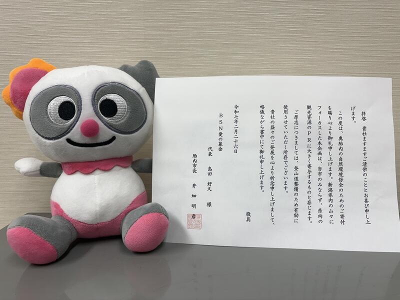 「BSN愛の募金×カメラマンが魅せられた新潟の山 4K上映会」で頂戴した「BSN愛の募金」54,130円を「奥胎内の環境保全のための協力金」として胎内市へ寄付させて頂きました。