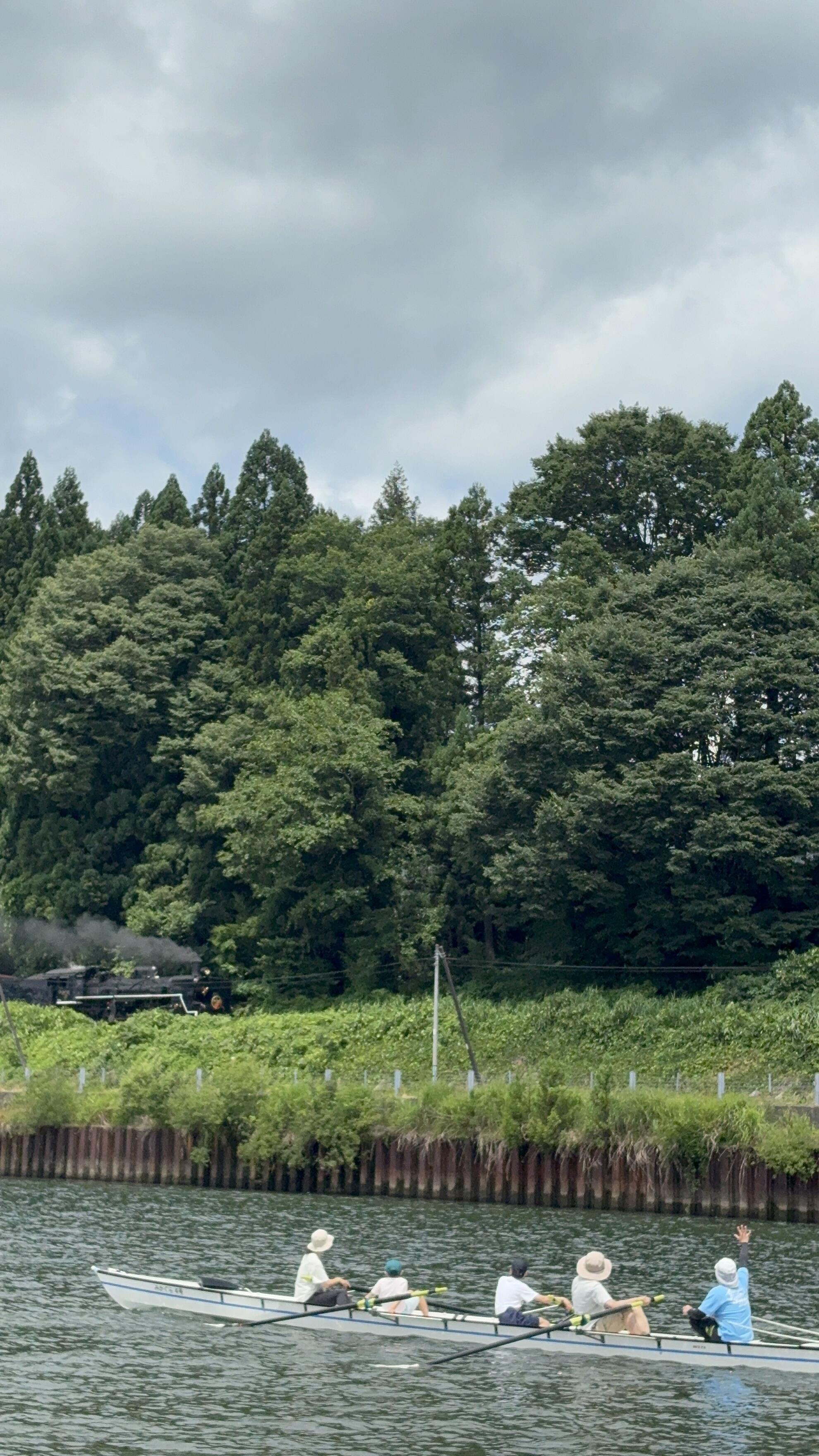 なんと「SLばんえつ物語号」がちょうど津川駅に入るところを阿賀野川からみんなで見ることができました!